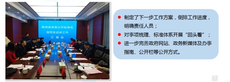五是倒排进度抓好下步工作。各试点单位根据省政府办公厅最新的指导性文件精神和指导组意见,制定了下一步工作方案,倒排工作进度,明确责任人员,对事项梳理、标准体系开展“回头看”,进行查漏补缺,优化升级;进一步完善政府网站、政务新媒体及办事指南、公开栏等公开方式,确保按期圆满完成任务。