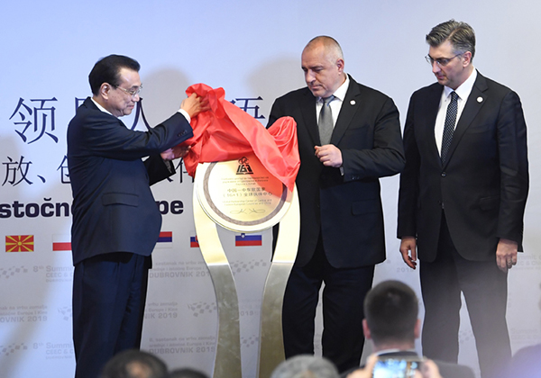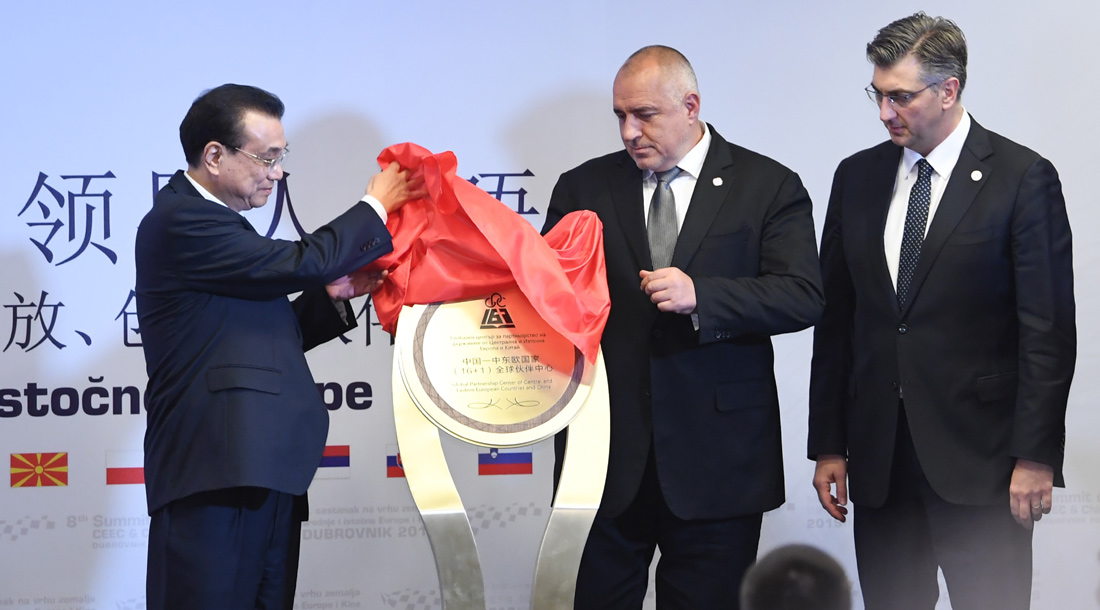 李克强与保加利亚总理鲍里索夫、克罗地亚总理普连科维奇共同为“16+1全球伙伴中心”揭牌