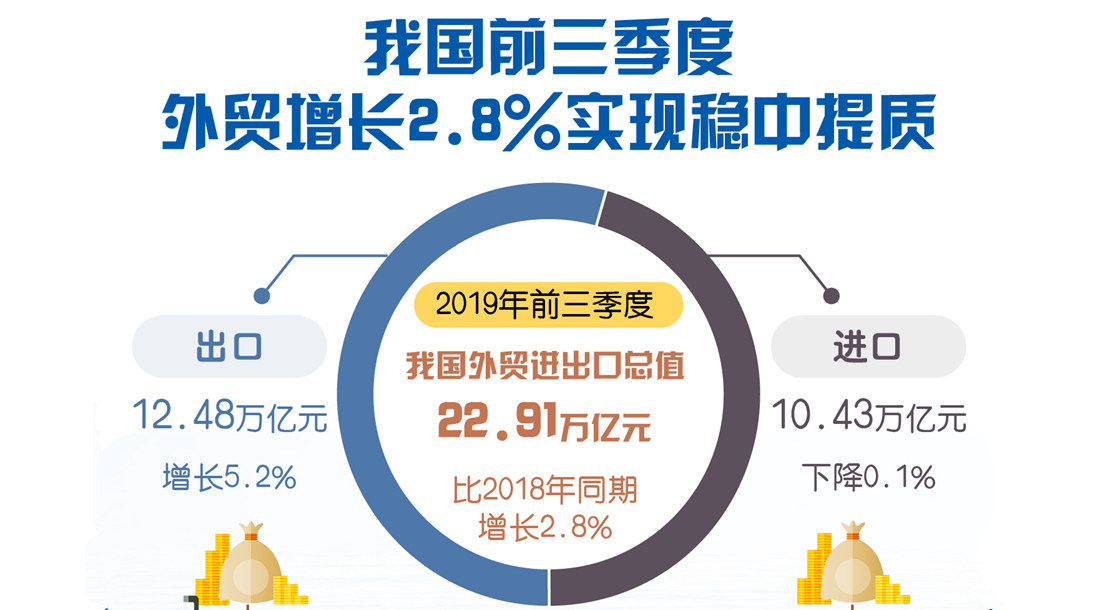 海关总署14日发布数据显示,今年前三季度,我国外贸进出口总值22.91万亿元,比去年同期增长2.8%,延续总体平稳、稳中提质的发展态势。