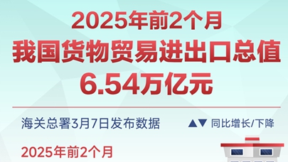 • 今年前2个月,我国货物贸易进出口总值6.54万亿元,同比下降1.2%。其中,出口3.88万亿元,规模创历史同期新高,同比增长3.4%;进口2.66万亿元,同比下降7.3%。