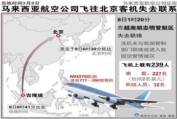 3月8日:马来西亚航空公司飞往北京客机失去联系